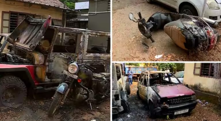 ഒരു ജീപ്പും കാറും ബുള്ളറ്റും പൂർണമായി കത്തി. ഒരു സ്കൂട്ടറും കാറും ഭാഗികമായി കത്തി നശിച്ചു. സംഭവത്തിൽ അന്വേഷണം ആരംഭിച്ചതായി പൊലീസ് അറിയിച്ചു.